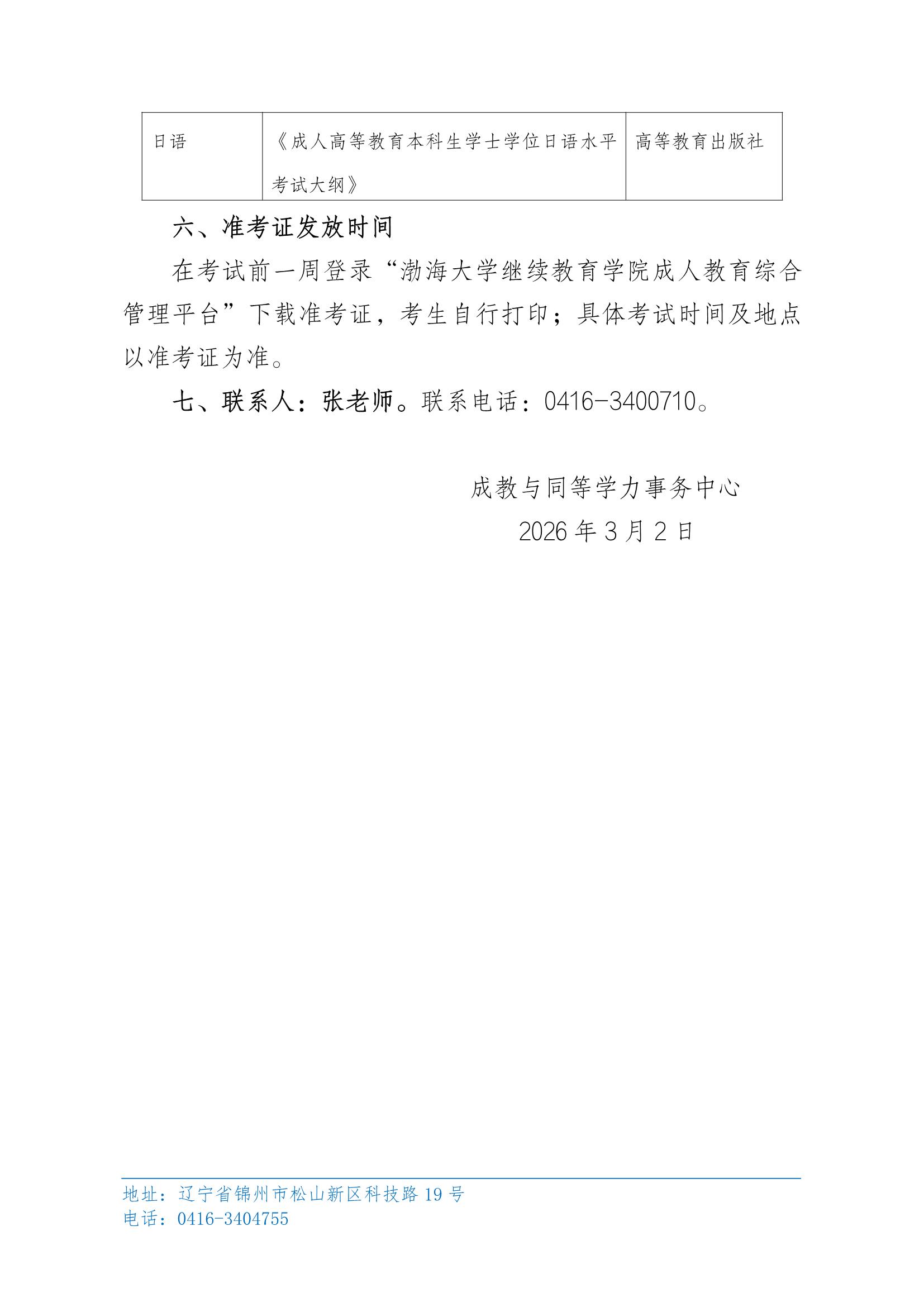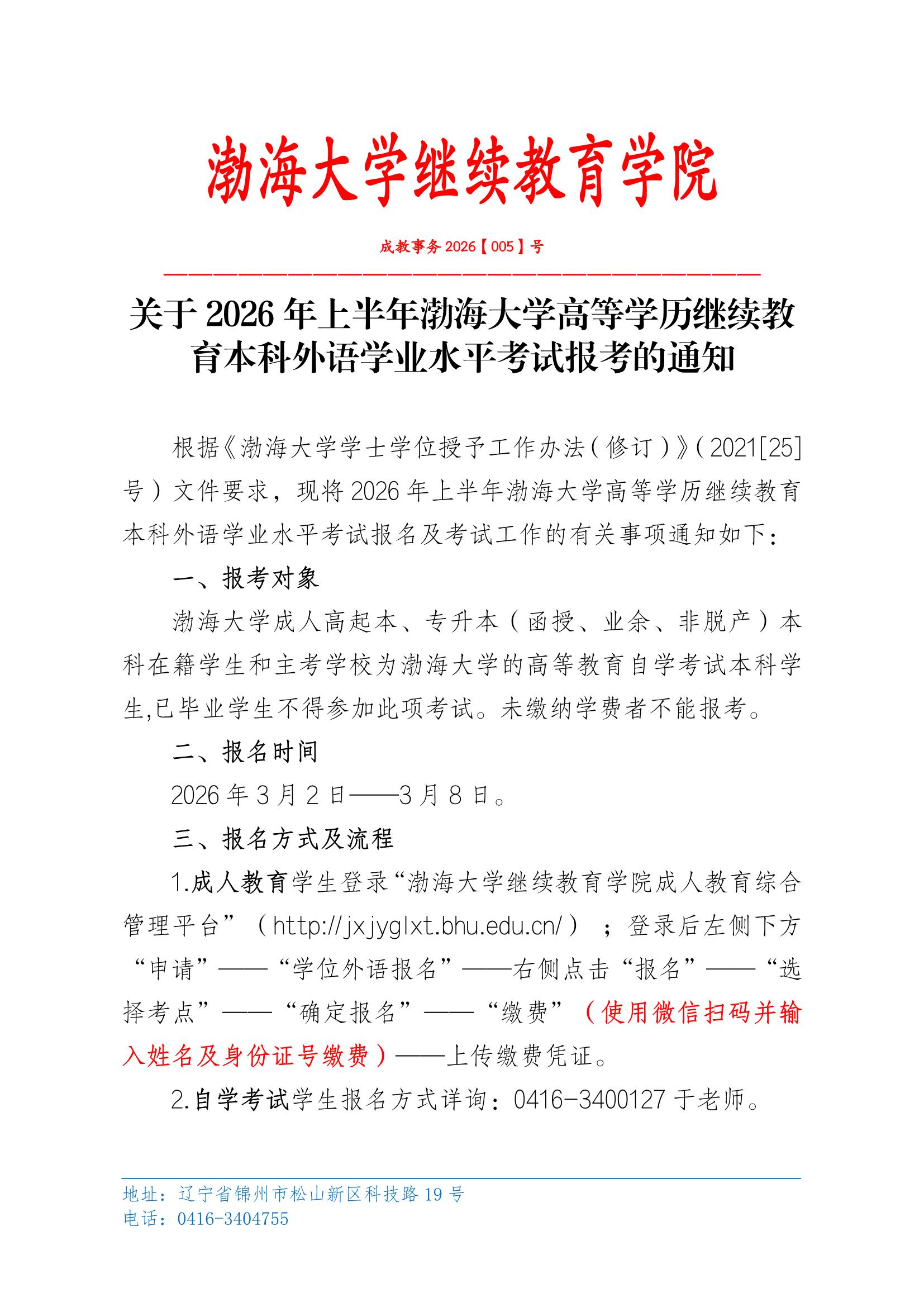 关于2026年上半年渤海大学高等学历继续教育本科学位外语学业水平考试报考的通知
